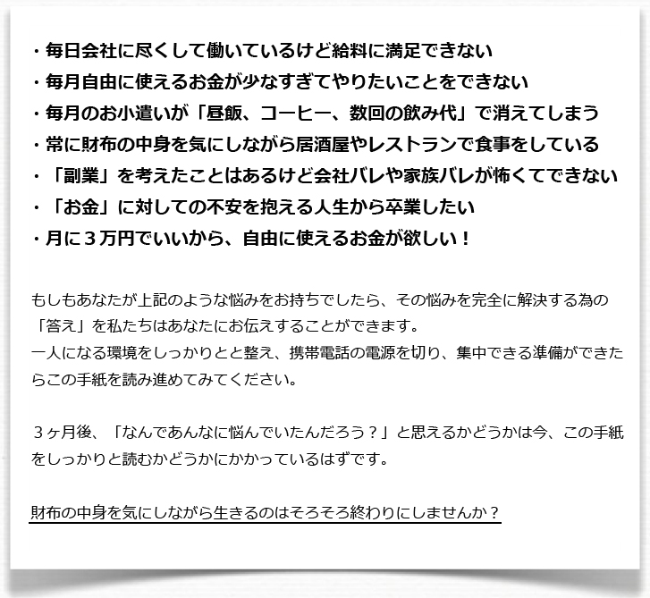 僕が知りうる限り、日本で一番「サラリーマンに副業で稼がせる能力」が高い、言わば秘密兵器のような男にその詳細を説明してもらいますので、もしあなたが一日でも早く給料以外で収入を得たいと思うのであればこの手紙の続きを真剣に読み進めてほしいと思います。